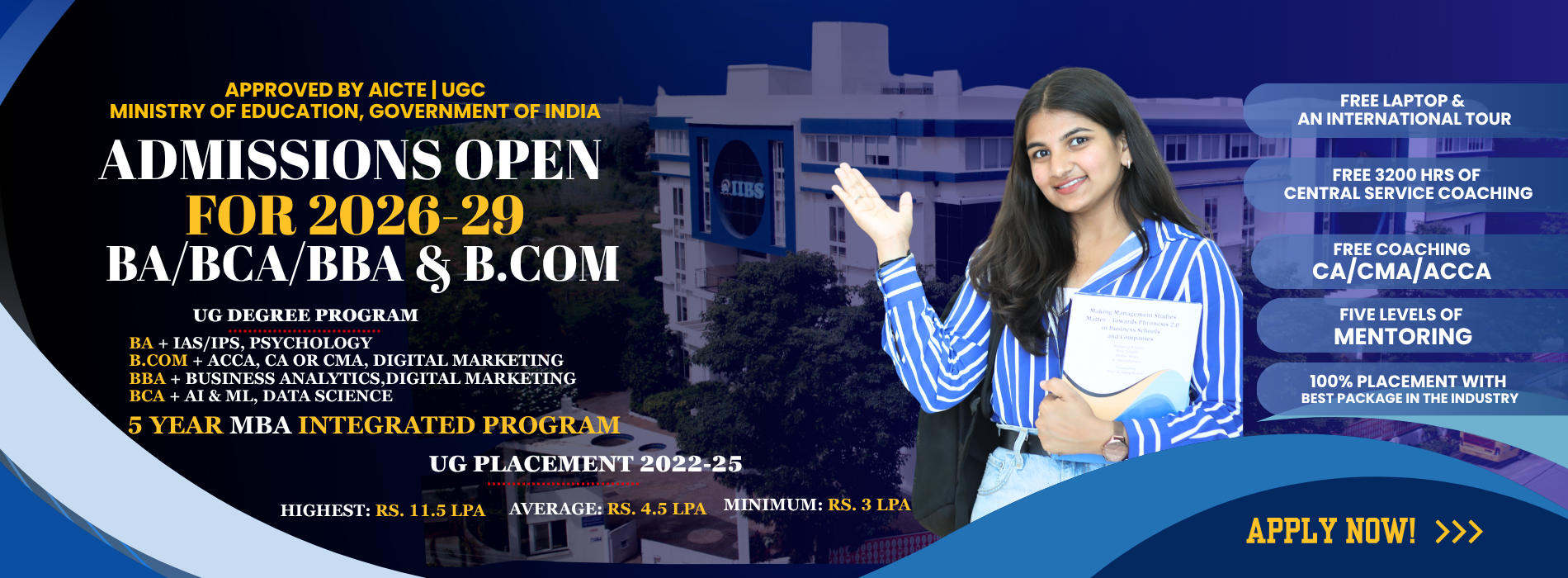 | BCA + Free IAS/IPS Coaching | 3 Years Degree | UPSC Prelims + Mains + Optional + SSC CGL |